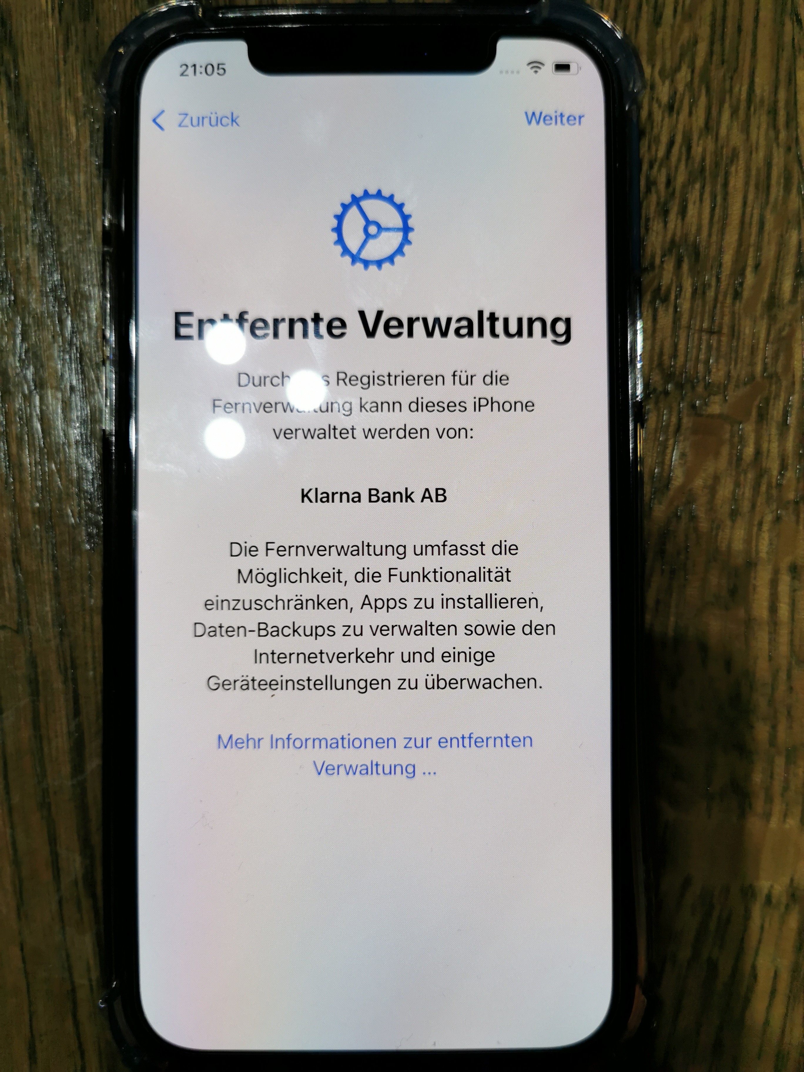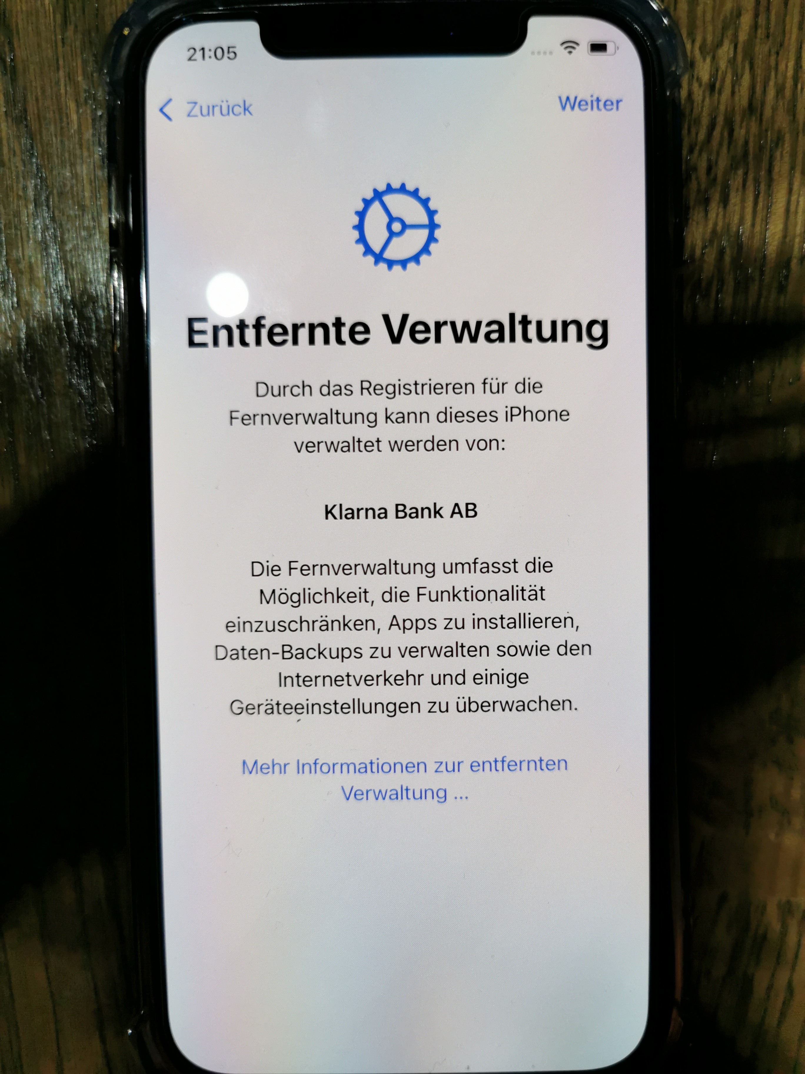 Es sieht so aus, als währe dieses IPhone bei im Apple Buisness Manager von Klarna eingetragen.