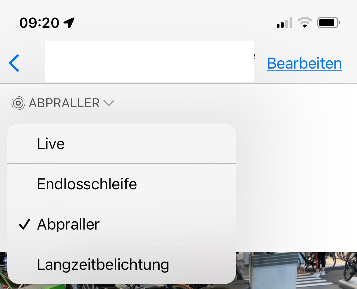 2. Sollten mit der Option „Rückblick im Film wiedergeben“ einzelne Live-Fotos nicht animiert angezeigt werden, kannst du die Animation forcieren. Wähle dazu das Live-Foto aus und definiere es zum Beispiel als „Abpraller“.