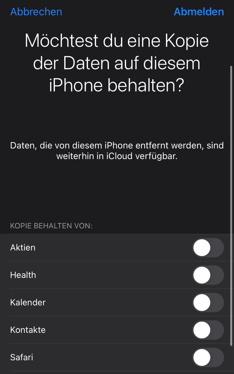 Beim Abmelden des Accounts, erscheint eine Meldung, ob die Daten, die durch die iCloud synchronisiert wurden auf dem iPhone gelöscht werden sollen oder eine Kopie erhalten bleiben soll.