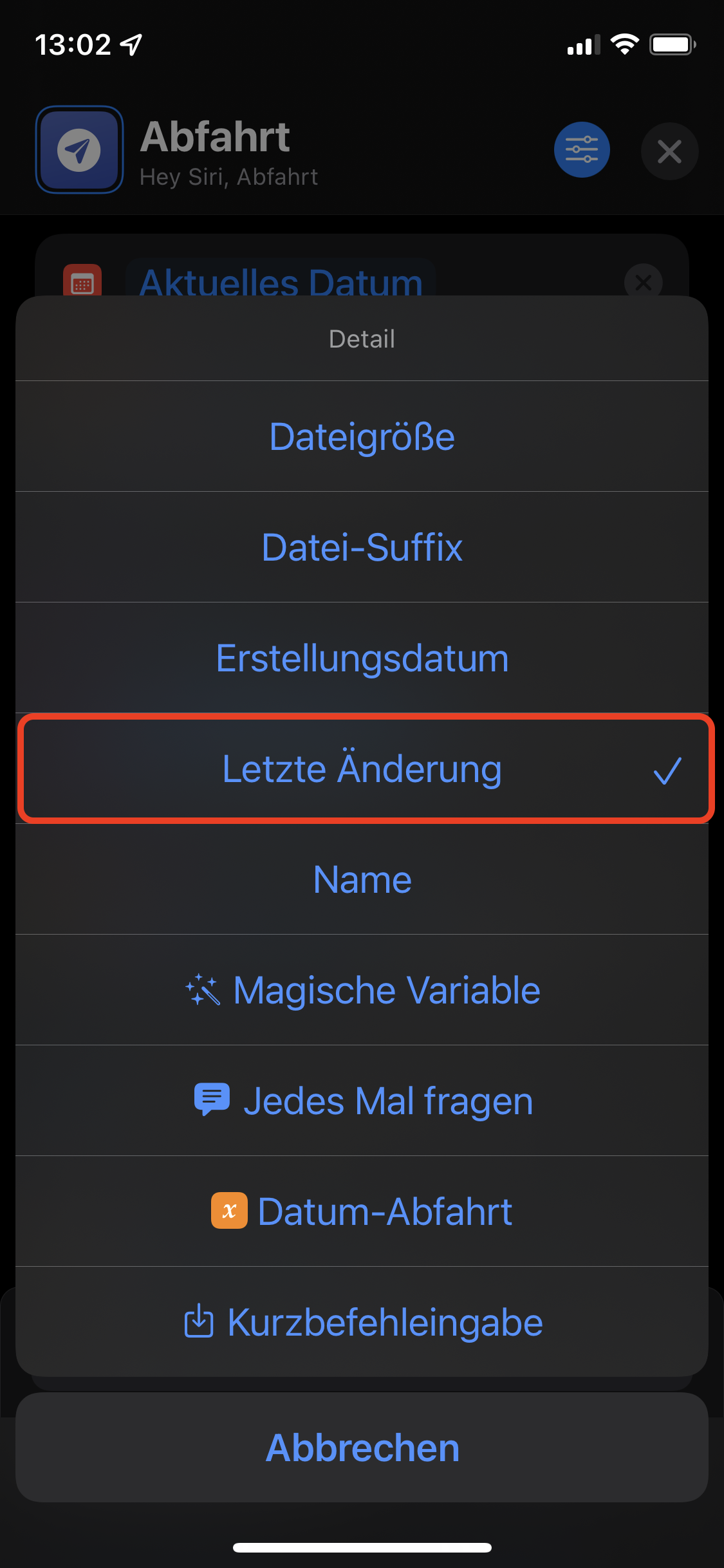 Der Bereich für die Dateiabfrage wird abgeändert (im Screenshot markiert). Lösche hier die bestehenden Einträge und füge den Kurzbefehl Datei aus Ordner laden hinzu. Hier wählst Du wieder den korrekten Pfad aus und ersetzt beispiel.txt mit dem Namen Deiner Datei. Nun wählst Du den Kurzbefehl Wörterbuch aus Eingabe abrufen aus. Es sollte automatisch die Variable Datei aufgeführt werden. Jetzt kommt der Kurzbefehl Wörterbuchwert abrufen. Für den Schlüssel gibts Du den Schlüssel aus der Ankunftsdatei ein. Das ganze wird nun wieder in die bekannte Variable gesichert