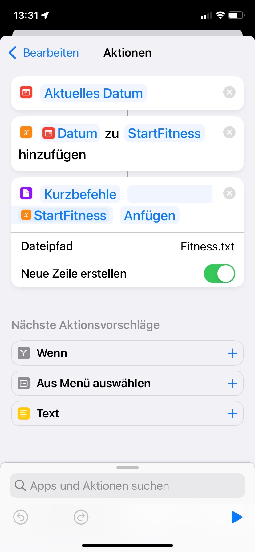 Nun wählst Du den Kurzbefehl Date sichern aus. Du wählst den Ablageort aus und klickst auf dem Pfeil hintern sichern. Es öffnet sich ein Menü. Hier wählst Du als Unterpfad den Dateinamen aus. Da mittels Wörterbuch eine JSON-Datei erstellt wird, habe ich auch die entsprechende Endung gewählt. Nun noch Überschreiben, falls Datei besteht aktivieren.