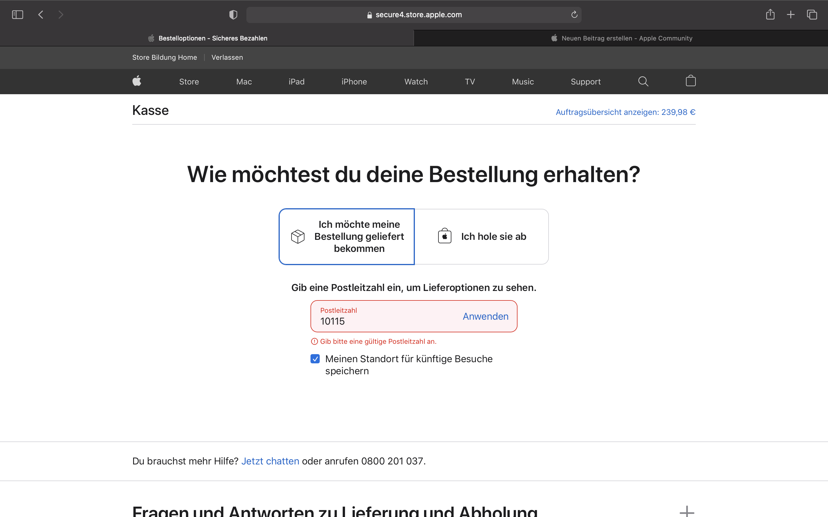 Ich habe folgendes Problem bei dem Kauf des Apple Pro Apps Bundle für Bildung: Vor beginn des Bezahlvorgangs werde ich gefragt ob ich das Produkt selber im Store Abholen will oder Liefern will. Ich tippe auf liefern. Dann werde ich nach einer Postleitzahl gefragt. Diese gebe ich ein doch anscheinend ist sie Falsch. Sie ist aber auf jeden fall richtig und ich gebe sie auch korrekt ein! (Siehe Screenshot)