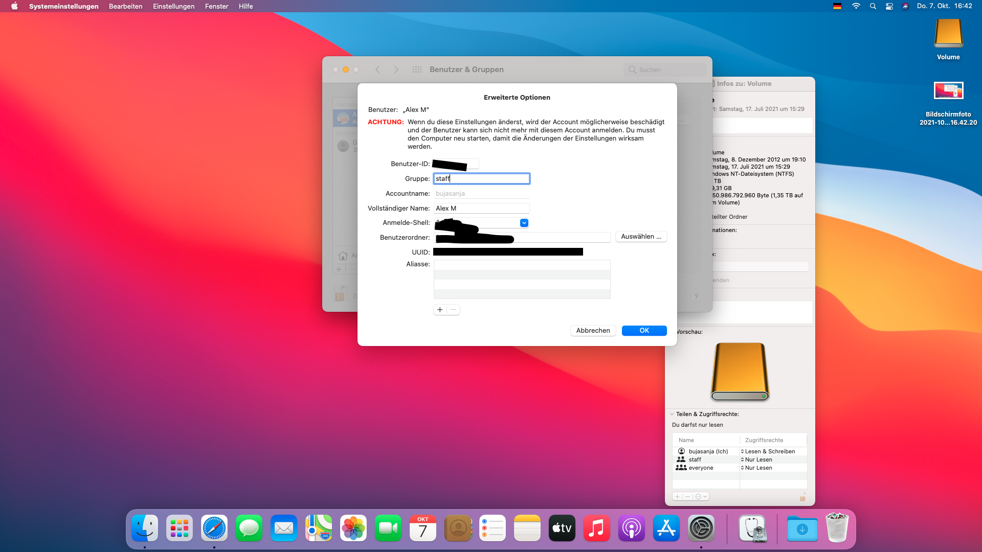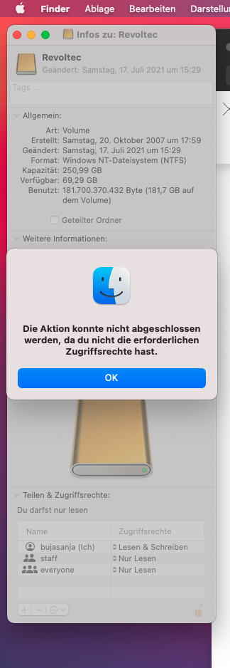 Hallo, ich habe nur ein Account dem Admin zugewiesen ist. Ich kann aber bei meiner externen Festplatte keine schreibrechte zuweisen weil das System sagt, Die Aktion konnte nicht abgeschlossen werden, da du nicht die erforderlichen Zugriffsrechte hast.