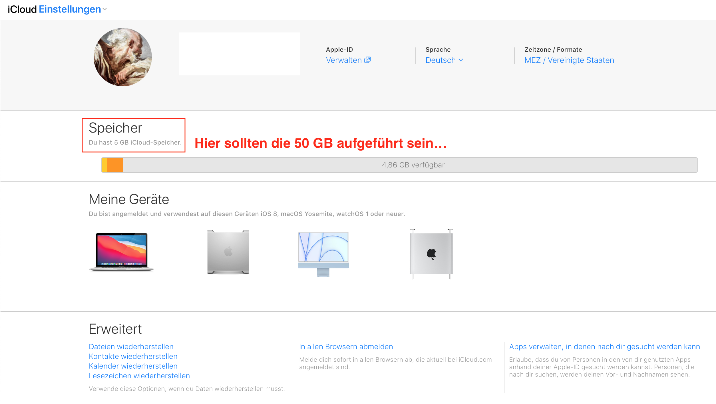 Habe letzte Woche eine iCloud Speichererweiterung von 5 auf 50GB gekauft. Diese Erhöhung wird weder auf meinem MacBook noch auf meinem iPhone 8 sichtbar. Was muss ich tun?