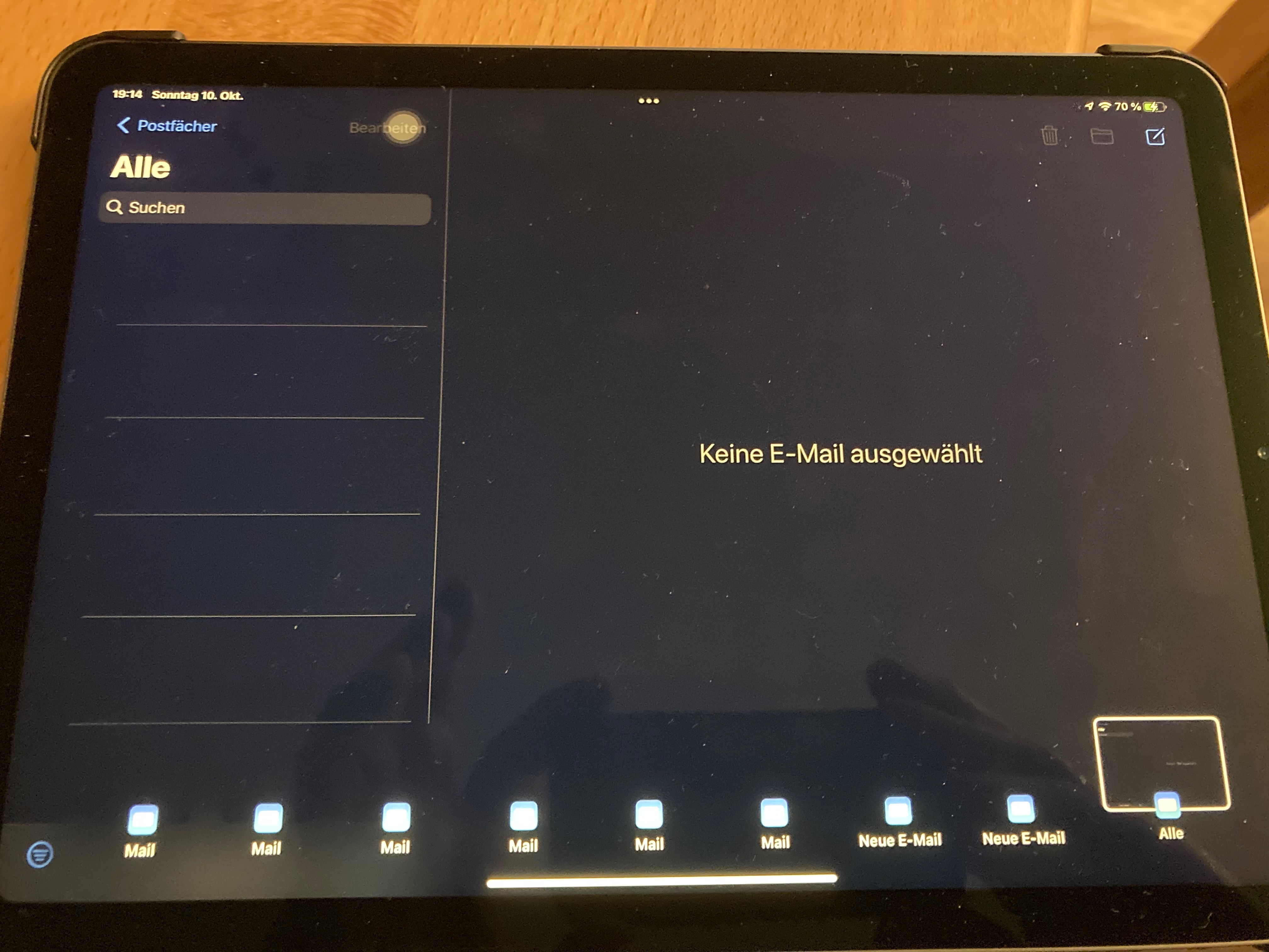 Hallo ich habe mein iPad Air (4. Generation) mit dem Update auf iOS 15 versorgt. Jetzt habe ich keinen Zugriff auf meine E Mails mehr. Nach öffnen der Mail App steht zwar Eingang auf „Alle“ aber keine Mails zu sehen. Wie auf dem Photo zu sehen: Unten am Rand stehen einige leere Blöcke kann man anklicken passiert aber nix. Fenster schließt sich dann von alleine wieder und das war’s. Kann man tippen wo man will passiert nix.