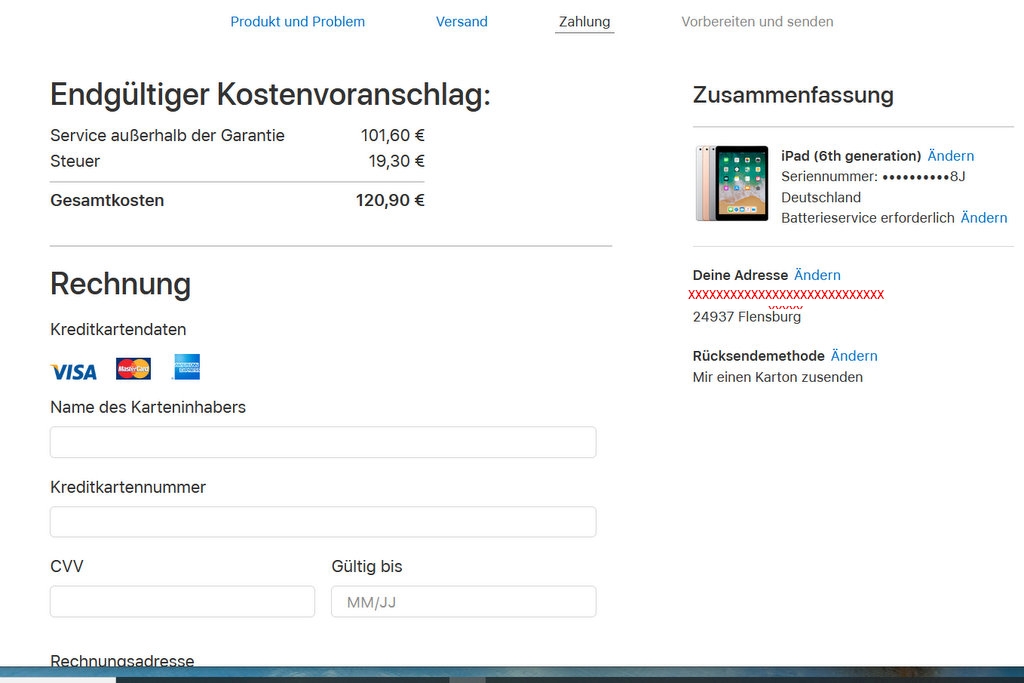 Falls nicht, kannst du auch zu einem Apple Store oder Autorisierten Apple Servicepartner gehen um deine Möglichkeiten zu besprechen. Dort kann man auch mit anderen Zahlungsmitteln bezahlen.