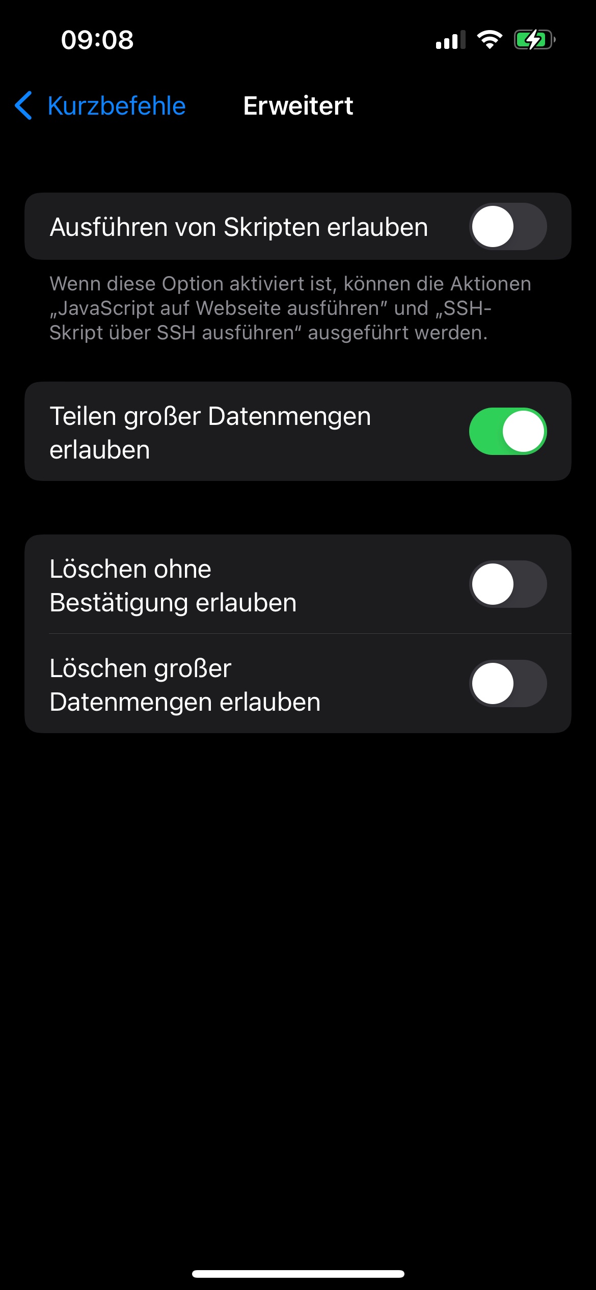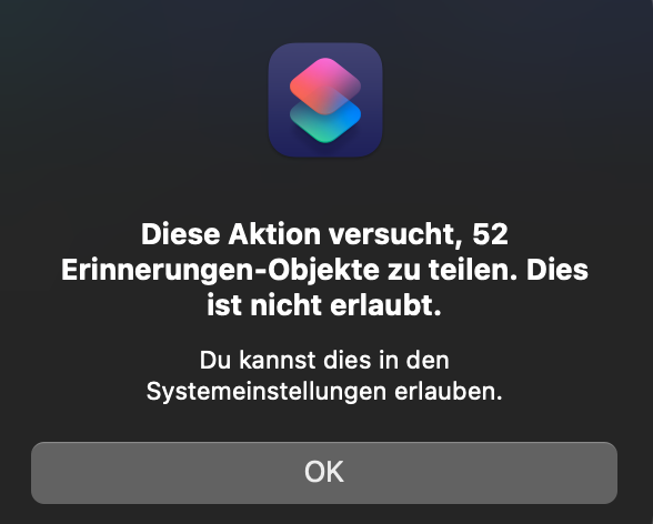 Ich würde vermuten, dass das Ganze etwas mit der Sicherheit zutun hat. Zu 100% kann ich dir leider auch nicht sagen, wo man das Ganze einstellen kann. Ich aber mal nachgeschaut und würde dir mal empfehlen, in den Einstellungen unter Kurzbefehlen reinzuschauen, dann unter erweitert. Nun glaube ich kommt es auf den Kurzbefehle an ob du auch das oberste aktivieren musst an, doch ich vermute, dass es eher der 2. Punkt sein wird, Teilen großer Datenmengen erlauben > an zuschalten. Probiere eventuell mal aus, ob dann dein Kurzbefehl funktioniert.
