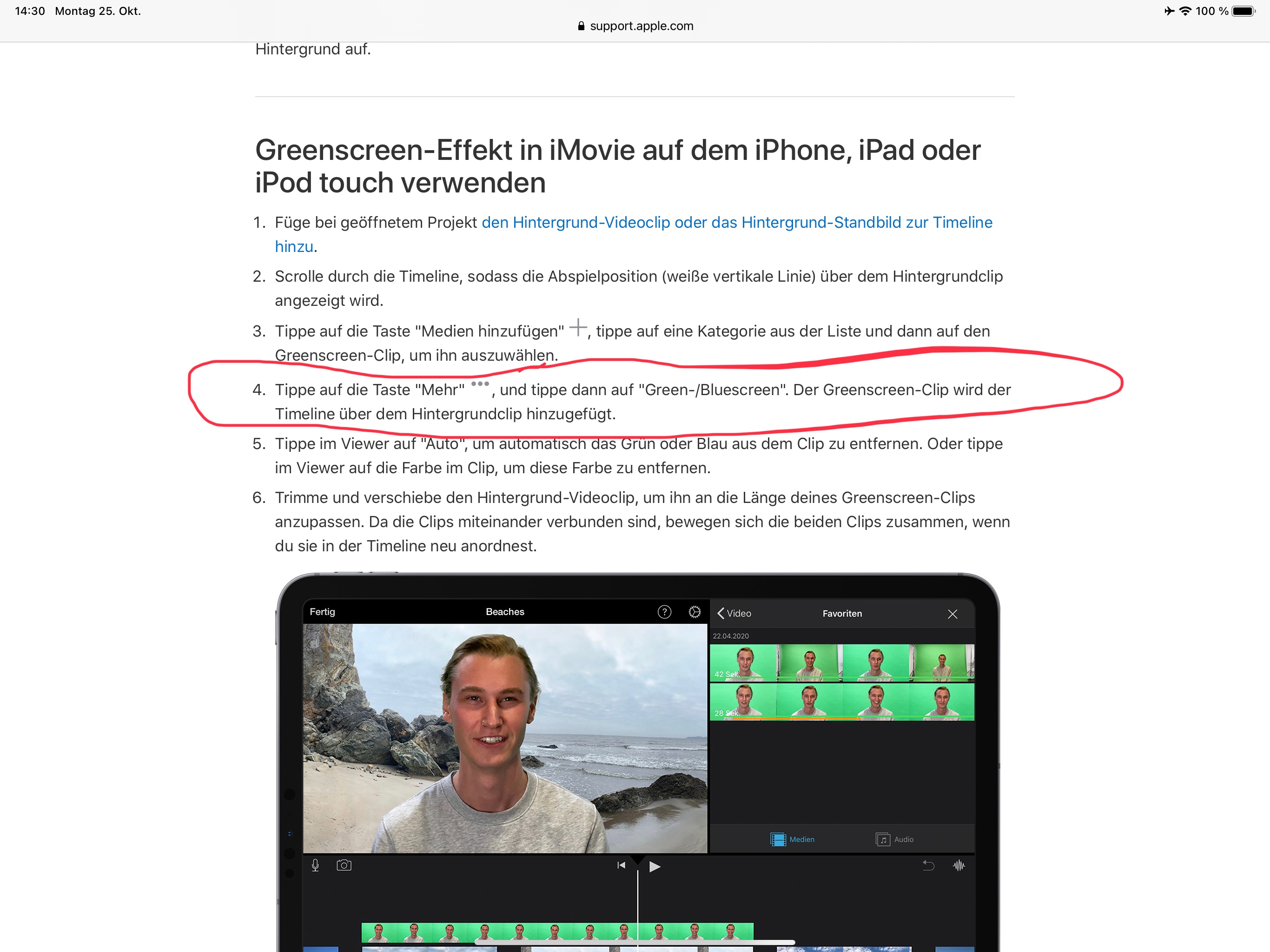 Hey, ich versuche den Hintergrund meines Videos zu ändern. In der Beschreibung von Apple steht unter Punkt 4. Ich soll auf die Taste mehr „…“ drücken, um Greencreen/ Bluescreen auszuwählen