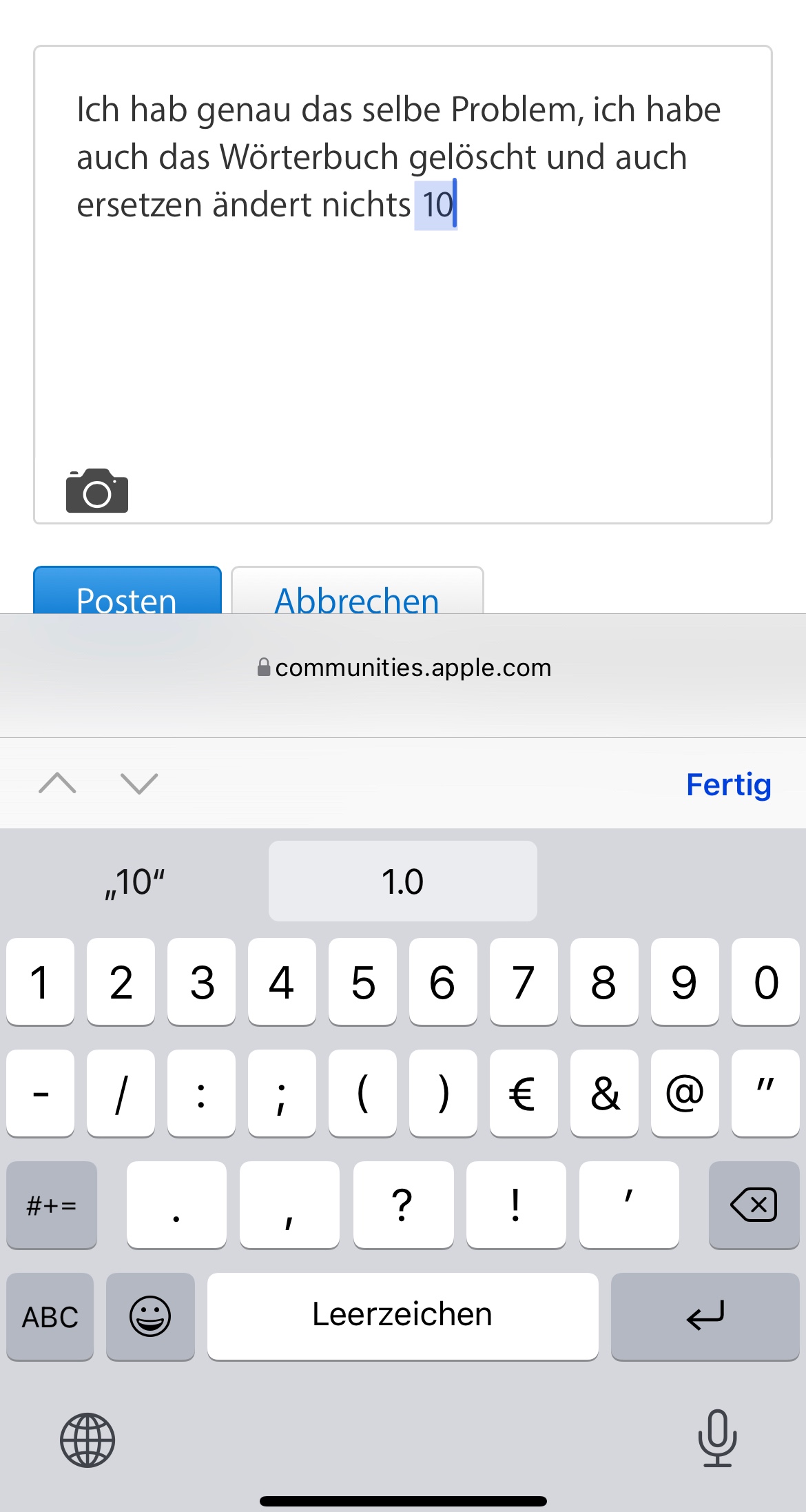 Mein Tipp, in den Einstellungen->Tastatur->Textersetzungen „10“ durch „10“ zu ersetzen, ist tatsächlich nicht so zielführend, man müsste ja endlos Texteersetzungen für alle Möglichkeiten erstellen.
