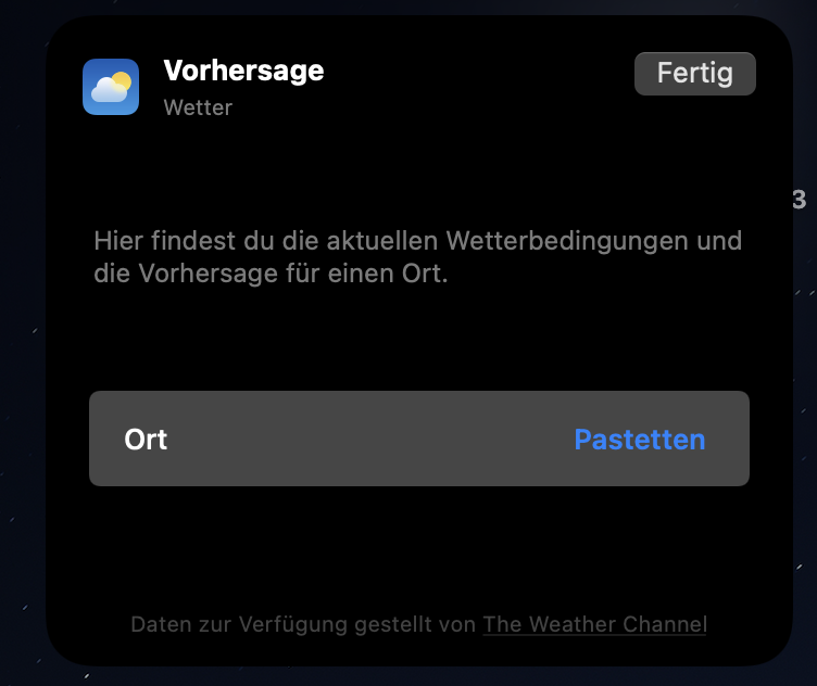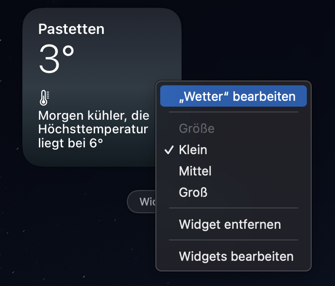 Widget auf den Schreibtisch ziehen und rechtsklicken und "Wetter" bearbeiten