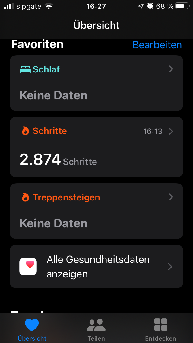 Zu diesem Thema sollten dir die Informationen im folgenden Support-Artikel weiterhelfen: Anzeigen deiner Gesundheitsdaten in der App „Health“ auf dem iPhone