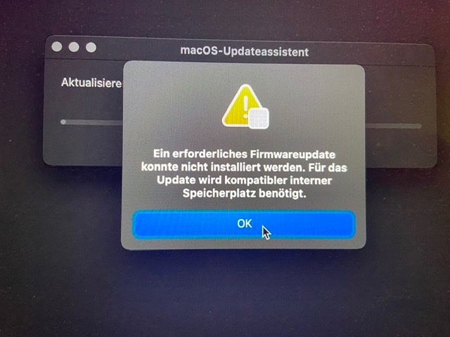die Installation von macOS Monterey führt beim Update als auch bei einer Clean-Installation zur Fehlermeldung: "Ein erforderliches Firmwareupdate konnte nicht installiert werden. Für das Update wird kompatibler interner Speicherplatz benötigt."