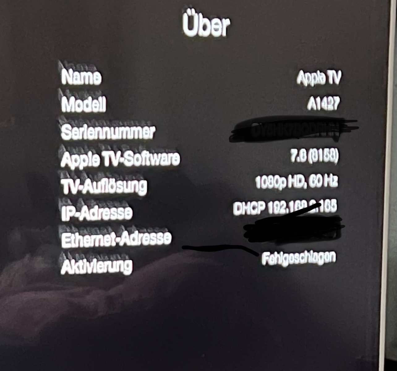 14. Im AppleTV auf Einstellungen --> Allgemein --> Über gehen. Dort wird der Eintrag "Aktivierung fehlgeschlagen" nun nicht mehr angezeigt.