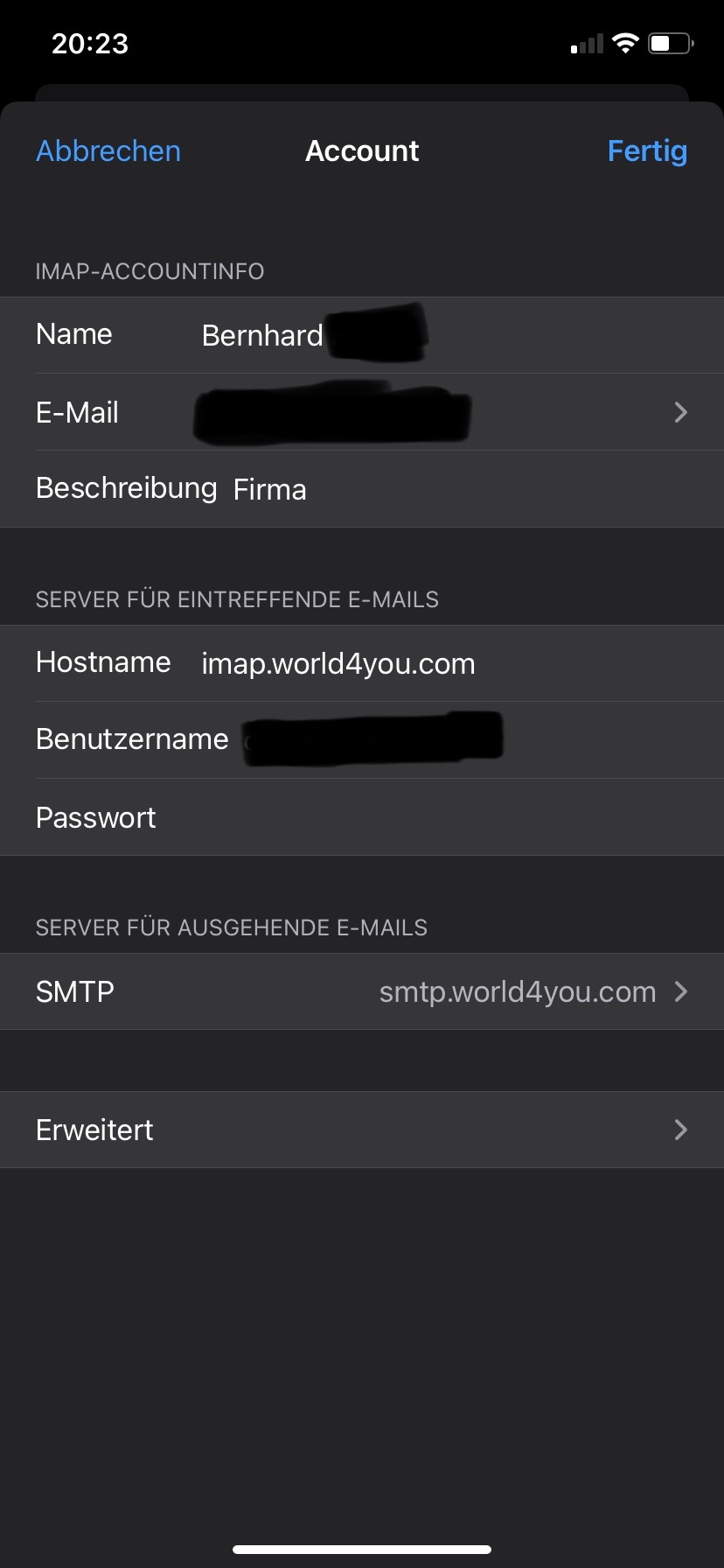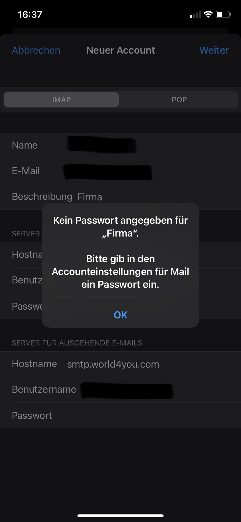 Ich erstelle den Account neu, gebe alle Daten korrekt ein und wenn ich fertig bin und auf "weiter" drücke erhalte ich folgende Fehlermeldung: "kein Passwort eingegeben für ...... Bitte gib in den Accounteinstellungen ein Passwort ein."