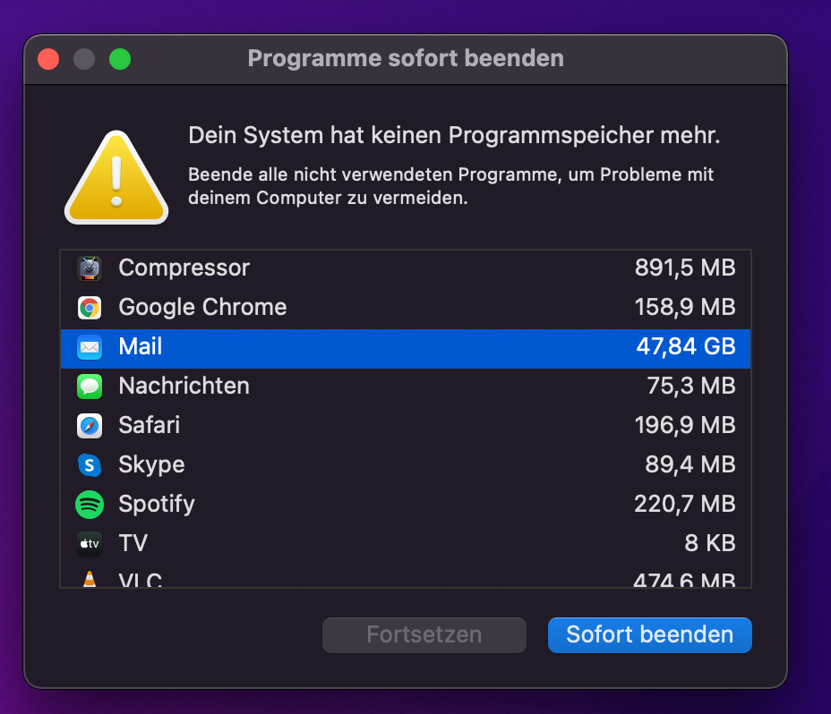 Danke für deine Antwort. Ich denke es ist auf jeden Fall nicht normal, dass die Mail App 48GB an Arbeitsspeicher benötigt, das ist wirklich etwas sehr viel. 😉