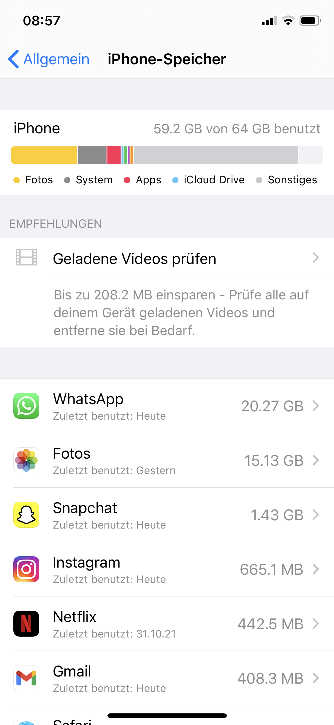 Trotzdem zeigt mir der interne iPhone Speicher als überfüllt an. Gerade z.B. Fotos macht einen riesen Teil aus, aber wieso, wenn ich ja die iCloud (auf der noch fast 1.5TB frei sind) aktiv habe?