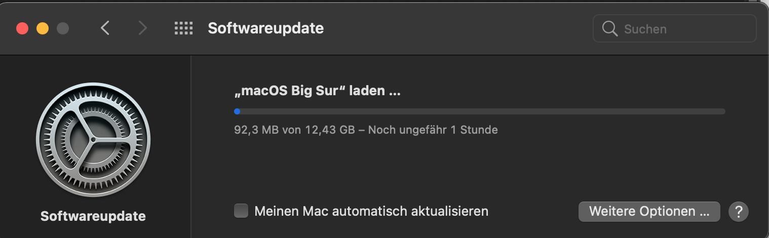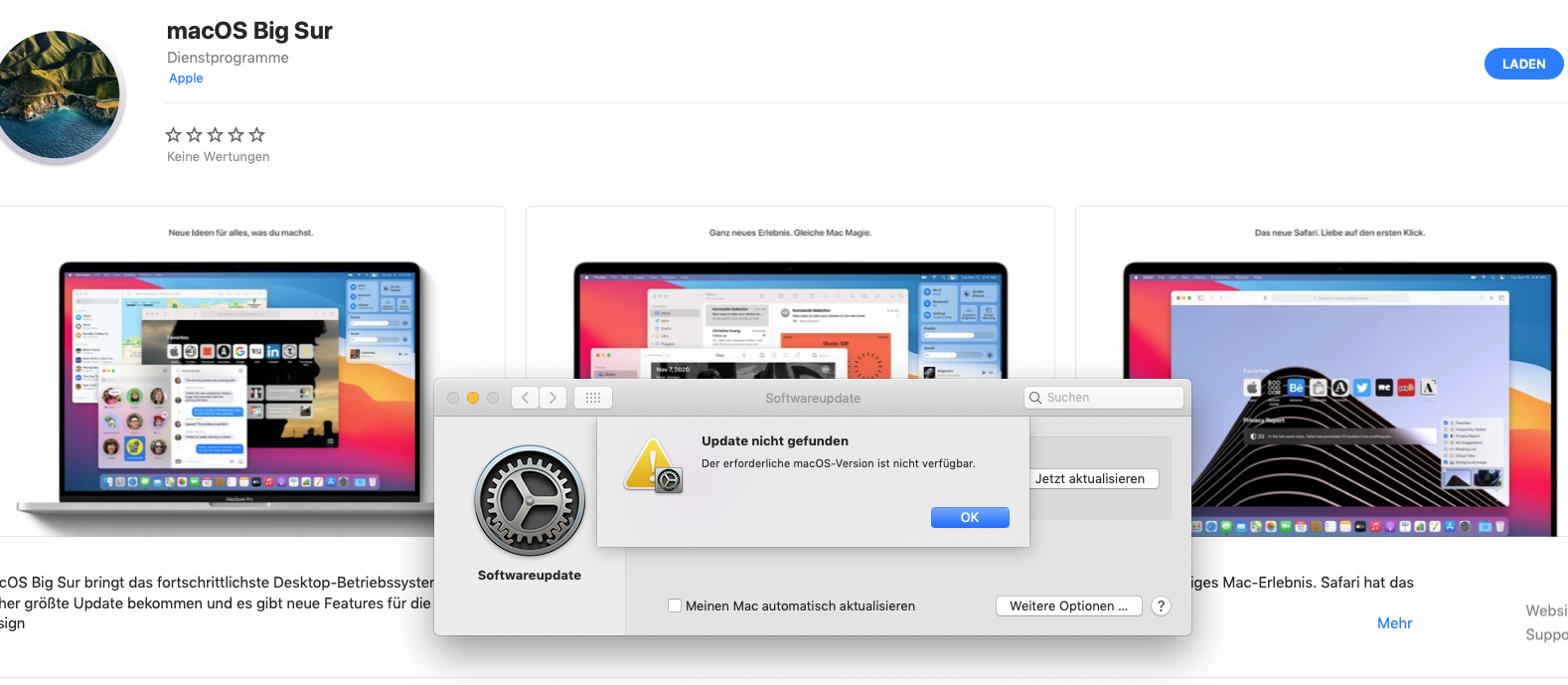 Wenn ich dann auf laden gehe, geht das Fenster von der Updatesuche auf und dann kommt die Meldung, dass die Version BigSur nicht verfügbar ist.