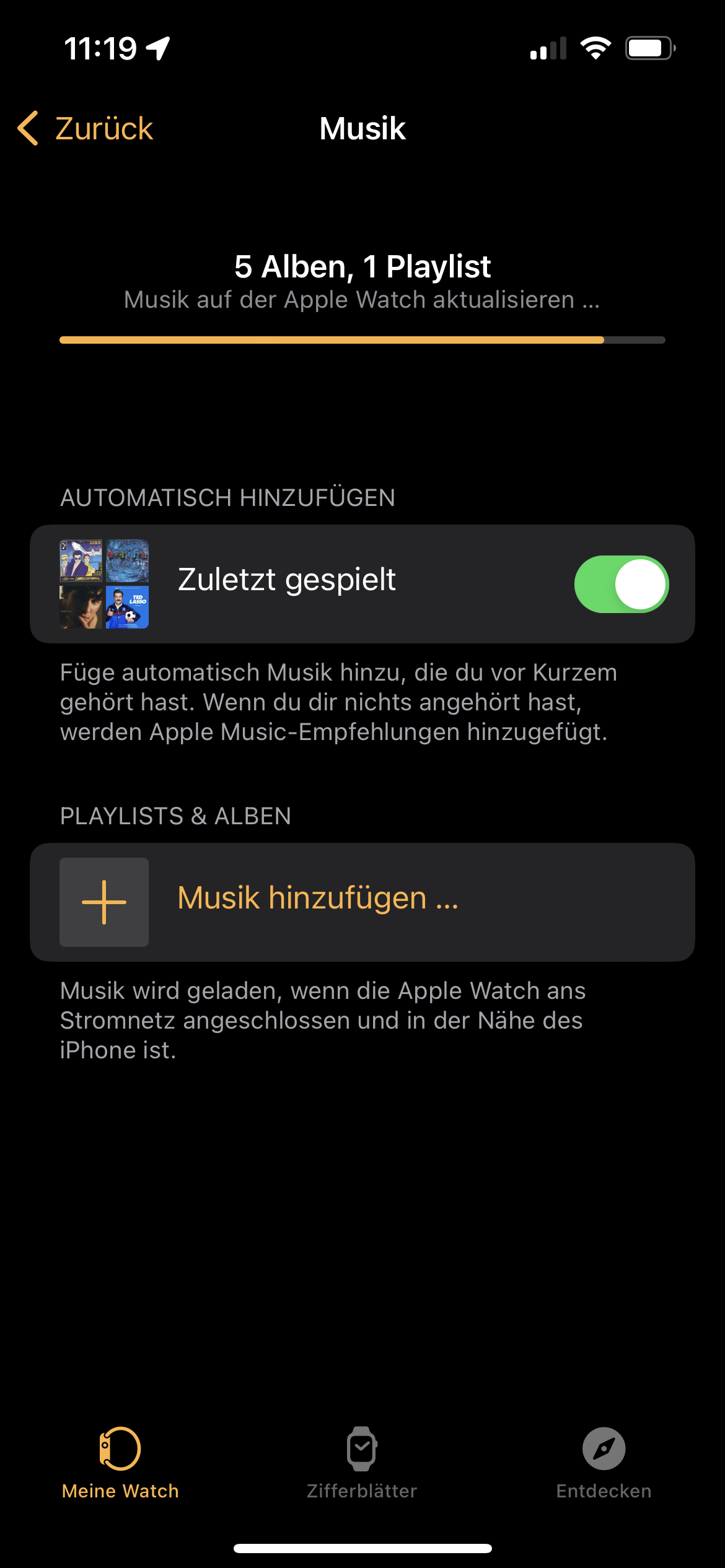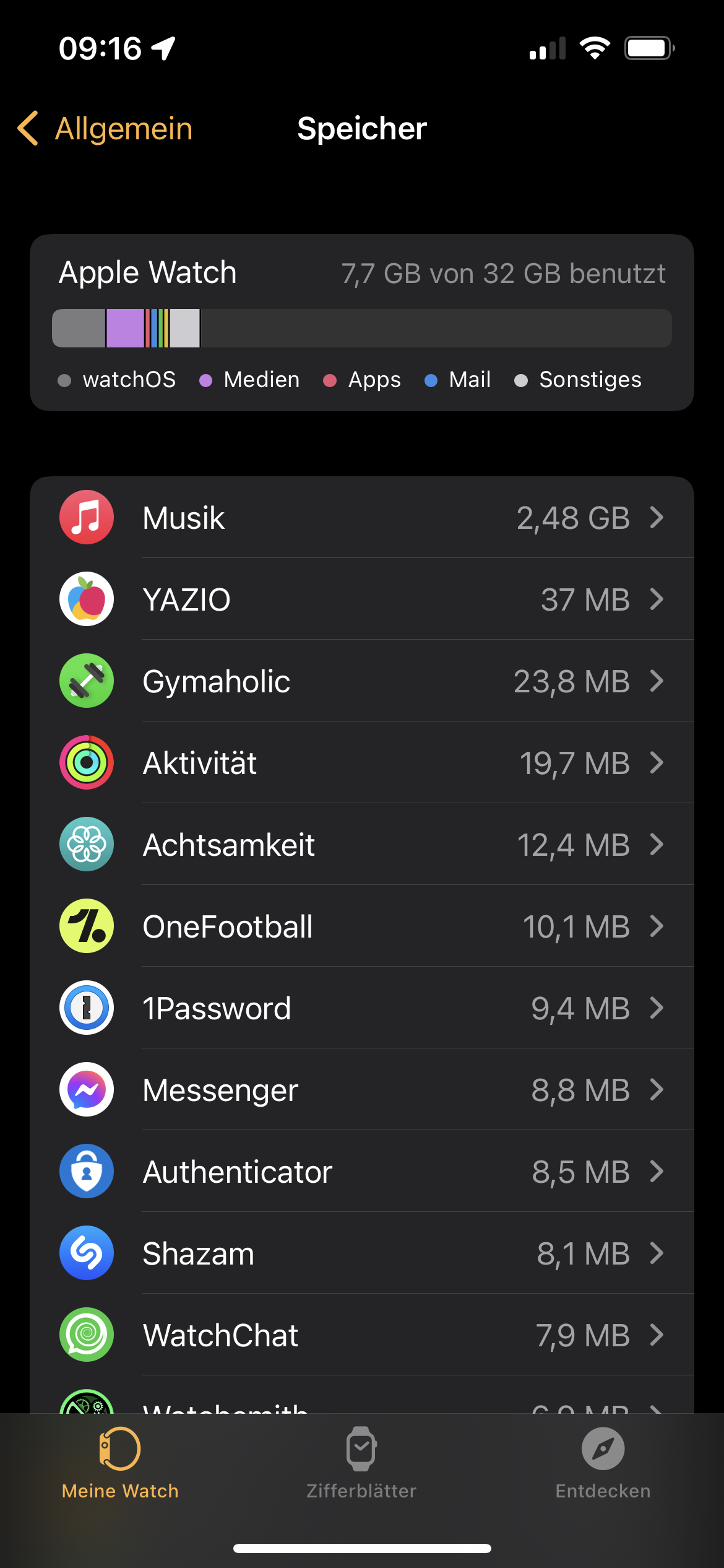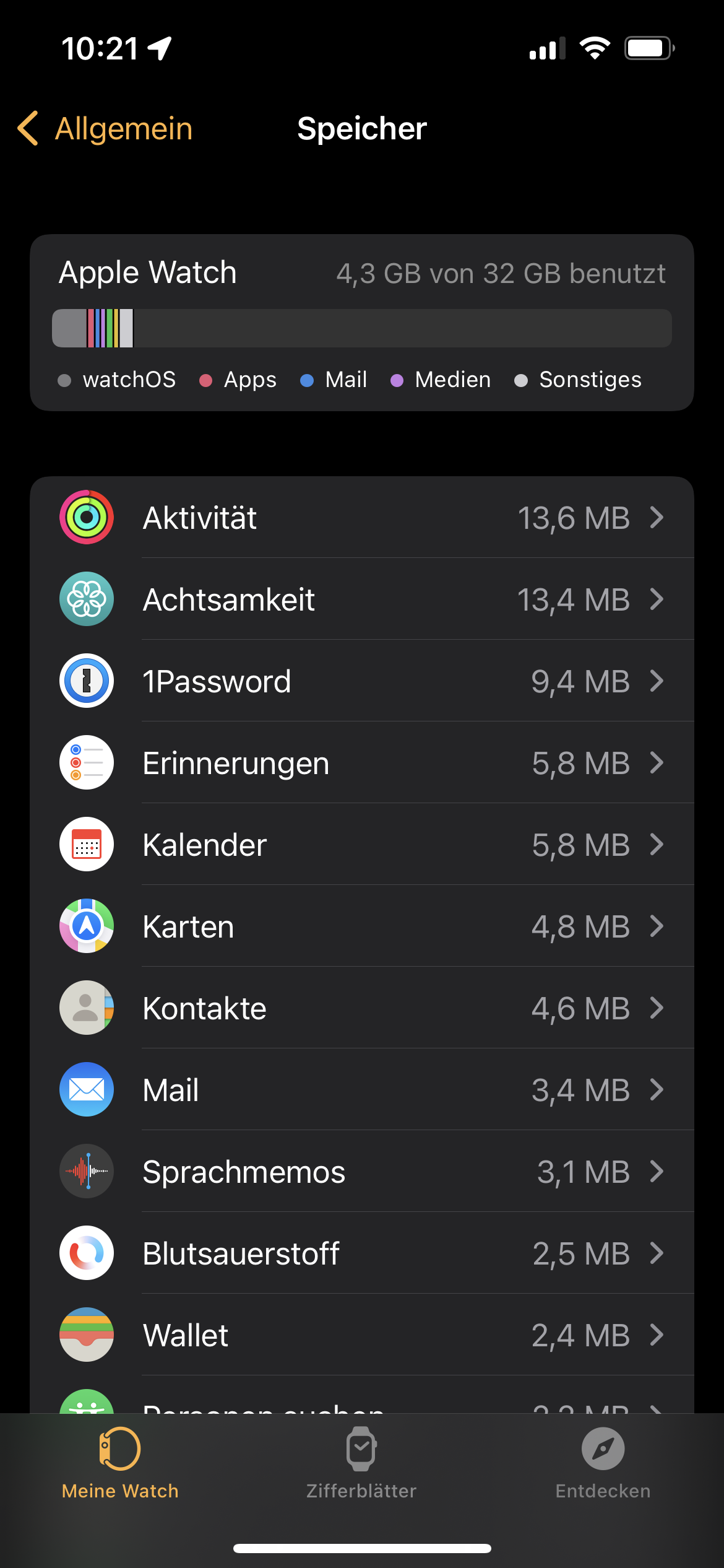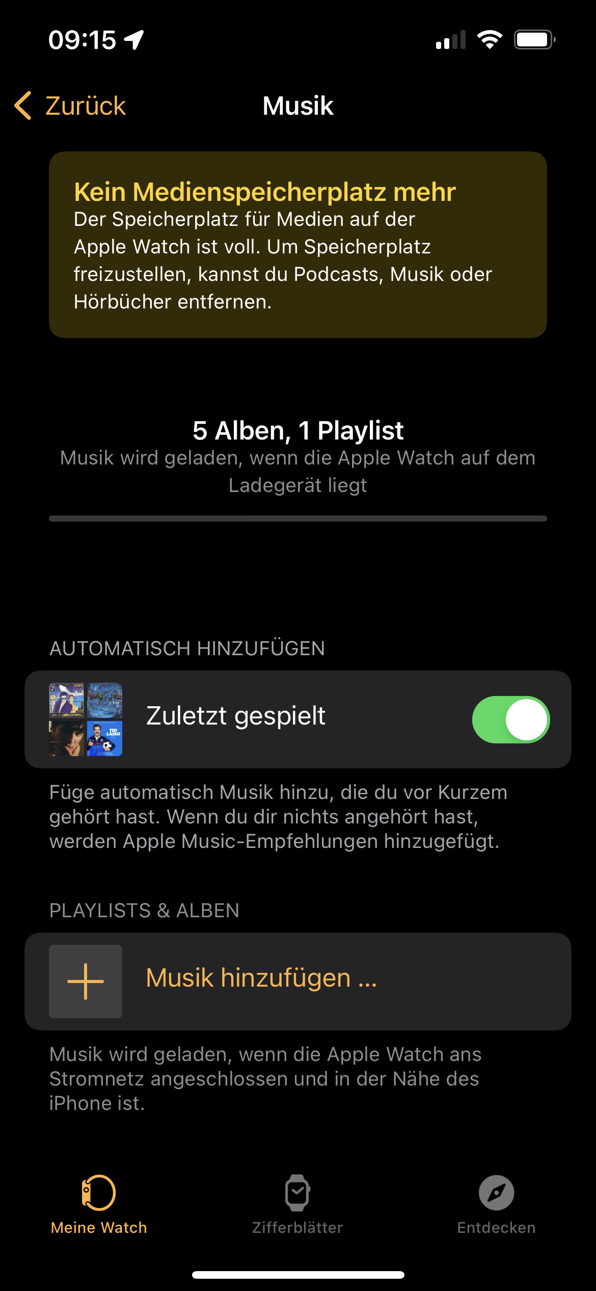 Wenn ich auf meiner Apple Watch 6 in die Musik App gehe, steht dort, das kein Medienspeicherplatz mehr vorhanden wäre. Wenn ich aber unter Speicher gucke, steht dort das noch 24GB frei sind. Spinnt die Uhr mal wieder ?