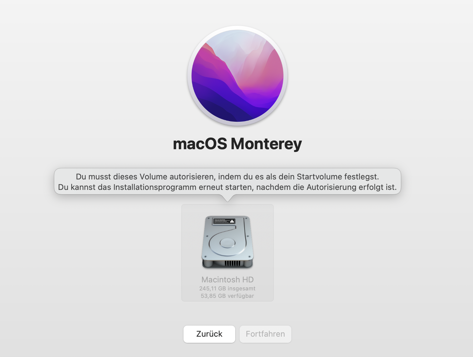 Ich kann nicht das neue Betriebssystem Monterey auf meinem MacBook Air M1 installieren. Die Fehlernachricht lautet: "Du musst das Volume Mactintosh HD autorisieren, indem du es als Startvolumes festlegst." (Bild 1) Wenn ich in den Systemeinstellungen schaue, dann ist das Startvolume ist aber bereits Macintosh HD eingestellt (Bild 2). Was ist zu tun ?