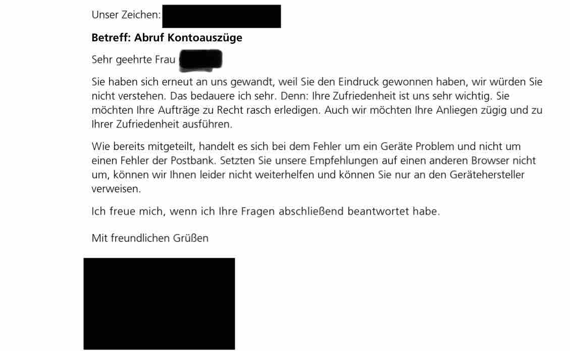 es liege an der „bekanntesten Fehlerquelle“ dem Safari Browser und nicht an der Postbank…
