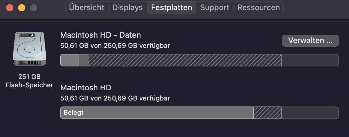 Wenn ich mir die Festplatteneinstellung angucke, werden mir 2 Festplatten angezeigt: Eine Macintosh HD, und eine Macintosh HD-Daten.