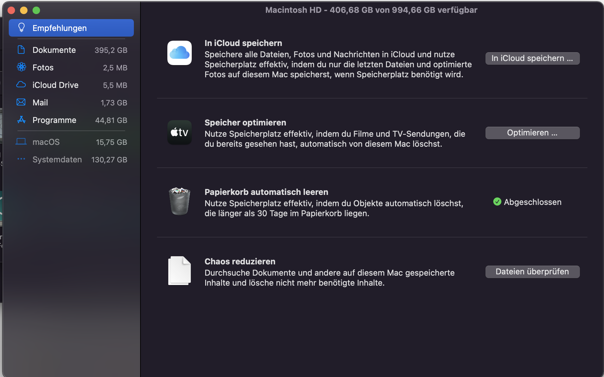 Das Programm EtreCheck hat nur davor gewarnt, dass aktuell kein TImeMachine Backup existiert. Das habe ich tatsächlich nicht aktiv. Ich habe in der Richtung schon von SnapShots gelesen, die den Systemspeicher belasten. Über die Kommandozeile sollte man diese jedoch auflisten lassen können. Bisher hat es nach dem Terminal nichts dergleichen getan.