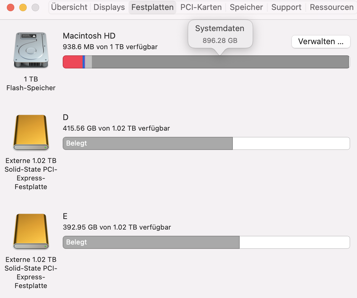 Hallo, ich habe bei einer 1TB SSd im Moment 865 GB Systemdaten und habe jetzt das getan was du vorgeschlagen hast, und meine grösster Ordner Application Support hat gerade mal 3, 19 Gb daran kann es dann nicht bei mir liegen, kannst du mir helfen ich habe jetzt gerade mal noch 41 GB freien Platz.