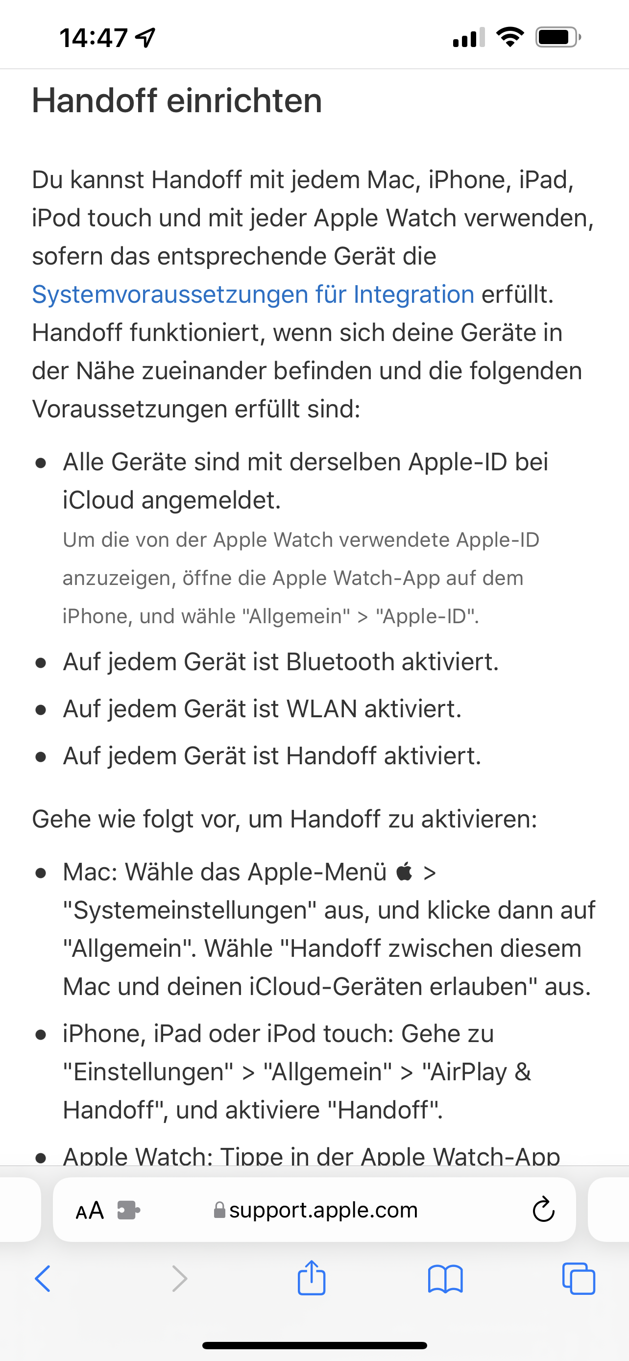 Bei mir ist auf dem iPhone (SE2) der Schalter für Handoff ausgegraut und lässt sich nicht bedienen.