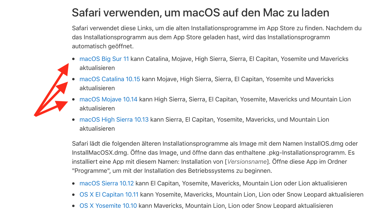 Für ein Upgrade öffne Safari ❗️und klick auf der nachfolgenden Seite des Apple Support einen der rot markierten Links an,
