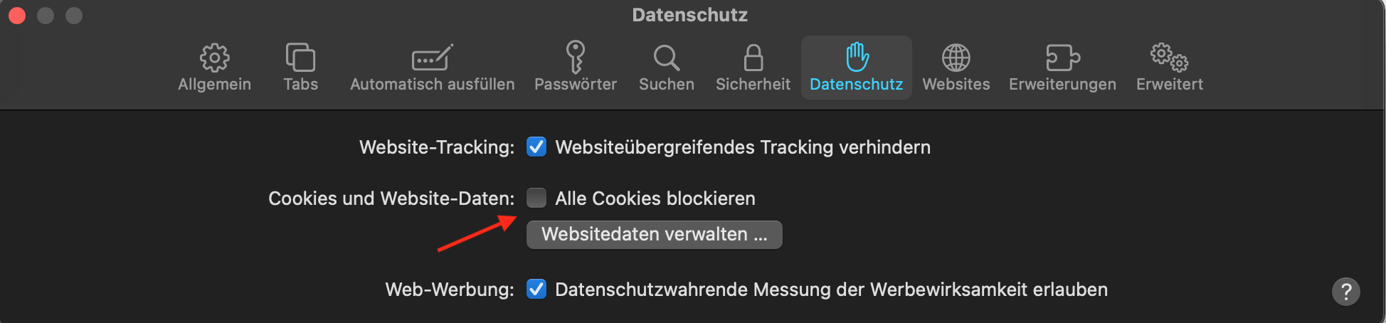 wenn du die Cookies in den Safari-Einstellungen nicht als ausdrücklich blockiert markierst (✅)
