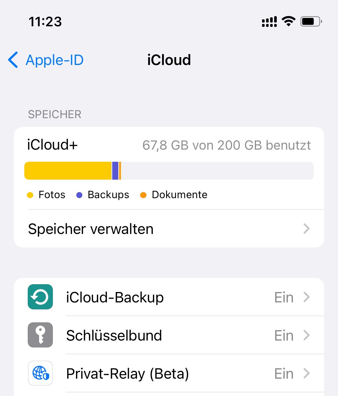 Wenn man in den Einstellungen auf dem iPhone ganz oben auf seinen Namen, dann auf den Punkt "iCould" tippt, sollten alle Einstellungen für iCloud aufgeführt werden. Oben auf der Seite die aktuelle Belegung des Speicherplatzes, und glich darunter "Fotos", gefolgt von iCloud Backup, Schlüsselbund, iCloud Drive, iCloud Mail, usw.