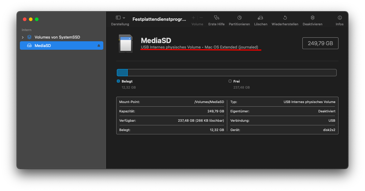 Eine an die TC angeschlossene Festplatte mit 6 TB wurde vom Airport-Dienstprogramm nicht erkannt, solange sie mit APFS formatiert war, und zwar unabhängig davon, ob sie zwei Volumes in einem Container oder zwei Partitionen hatte. Erst mit HFS+ wurden die beiden Partitionen angezeigt.