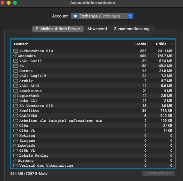 Wo sind die 5 Giga versteckt, wie kann ich sie löschen. Ich habe festgestellt, dass es sich um meine Exchange Microsoft email handelt. Die andern Adressen brauchen kaum Speicher.