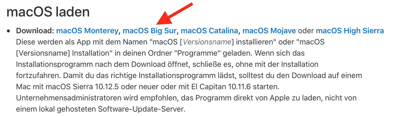 Hierzu lade dir den Big Sur-Installer durch Klick auf den markierten Link auf der nachfolgenden Seite des Apple Support mit Safari direkt in den Programmordner