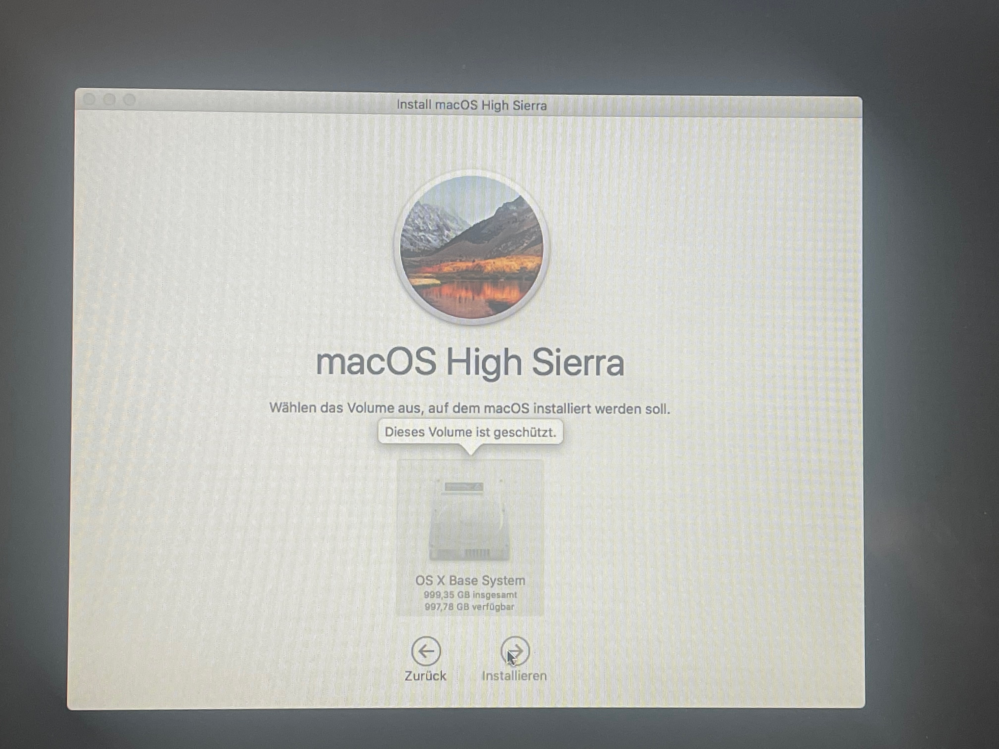 beim meine imac ich habe Probleme beim macOS High Sierra neu instalieren ich meldung das OX X Base System mit einem Volume mit 997 GB geschützt