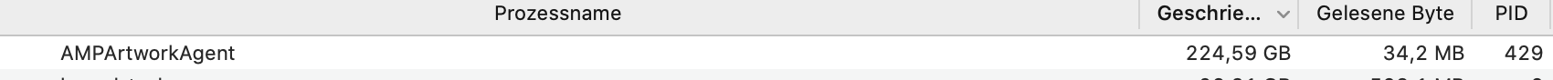 Jetzt wo ich diese Zeilen schreibe, bläst der Lüfter auf Maximum und der Prozess AMPArtworkagent hat sich nach 15 Minuten auf 16 GB geschriebene Bytes erhöht und hört nicht auf.