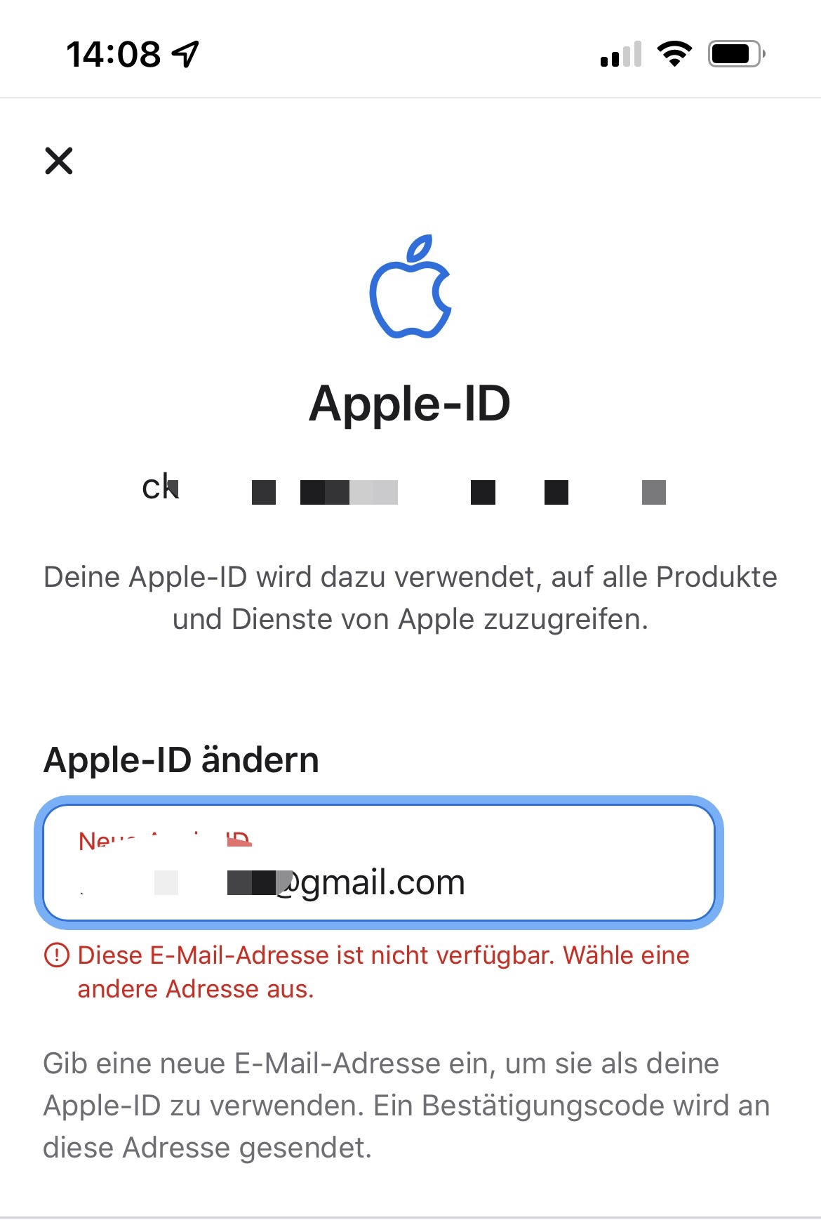 Ist diese Gmail Adresse möglicherweise bereits Teil deiner jetzigen Apple-ID, also wird diese zur Kommunikation mit Apple oder ist diese zur Sicherheit als E-Mail Adresse hinterlegt. Melde dich bitte auf der Apple-ID Seite mit deiner Apple-ID an: appleid.apple.com und überprüfe, ob diese Gmail Adresse irgendwo auf dieser Seite auftaucht.