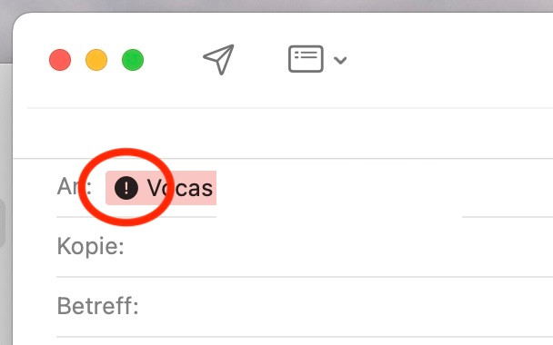 beim Verfassen einer neuen Nachricht versieht Apple Mail den Empfänger grundsätzlich mit einem schwarzen Kreis + Ausrufezeichen. (Siehe Anlage)