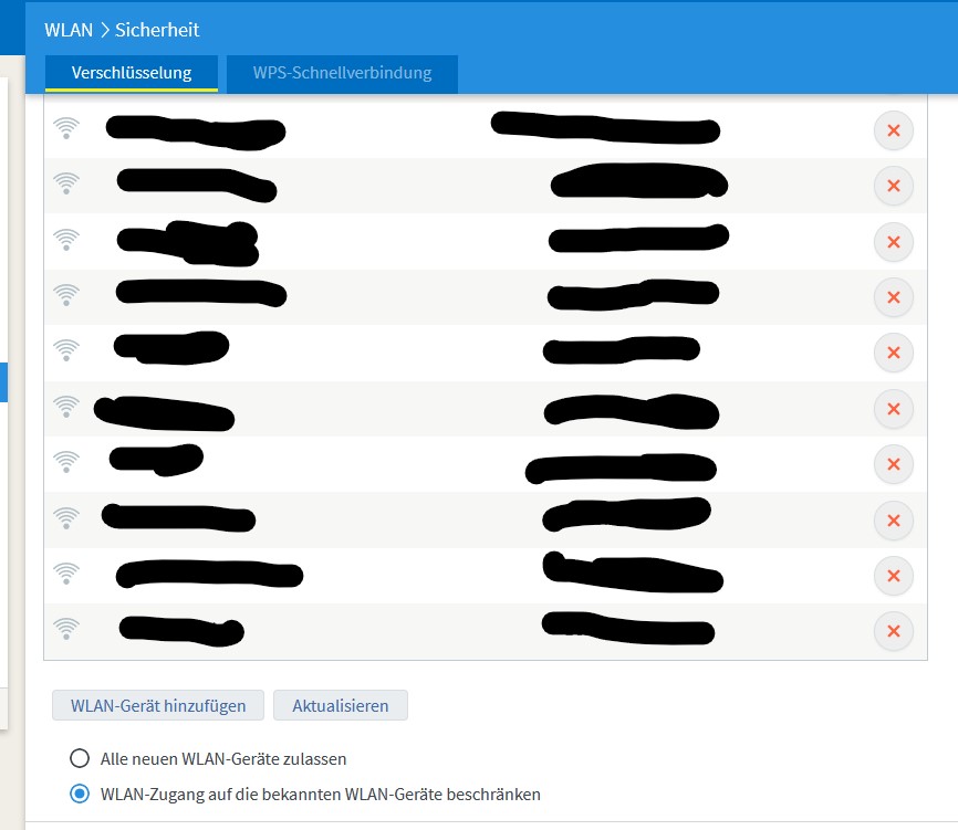 Wenn die Einstellung "WLAN-Zugang auf die bekannten WLAN-Geräte beschränken" gewählt ist, dann wird die Netzwerkverbindung nur für Geräte hergestellt, die unter Menü Heimnetz -> Netzwerk bereits vorhanden sind. Neu hinzukommende Geräte werden dann nicht zugelassen. Um sie ins Netz zu lassen muss "Alle neuen WLAN-Geräte zulassen" ausgewählt sein.