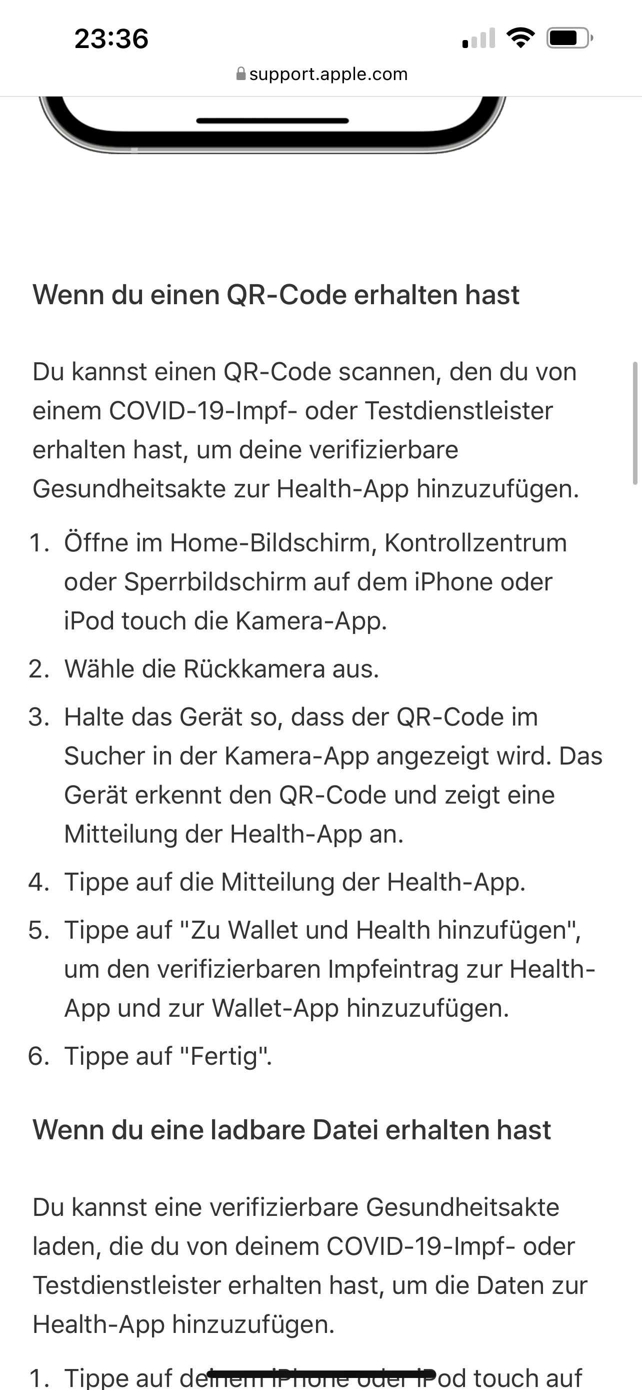 Ich will meinen corona QR code wallet fügen aber die Kamera Scannt das nicht sondern sagt die CovPass kann das nur und wenn ich es mache geht es nicht mit 2seiten Drücken also es wird nicht angezeigt