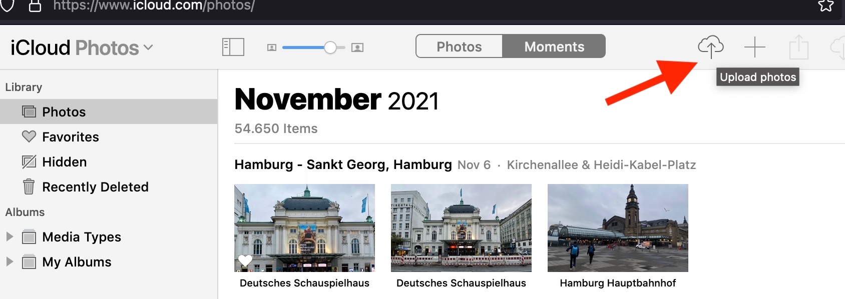 Dann sollte sich ein Fenster öffnen, in dem du Fotos und Videos zum Hochladen auswählen kannst, auch von der externen Festplatte, wenn dein alter Mac sie noch lesen kann.