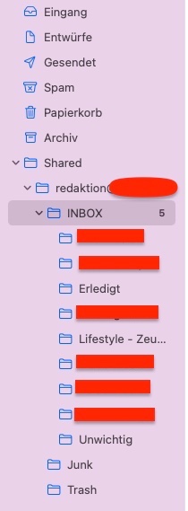 ich habe in meinem Apple Mail ein geteiltes Postfach abonniert. Da kommen auch die Email alle an und werden in der Inbox angezeigt. Zudem gibt es neben der Inbox weitere Unterordner, in welche die Mails aus der Inbox verschoben werden. Bisher ging das immer ohne Probleme.