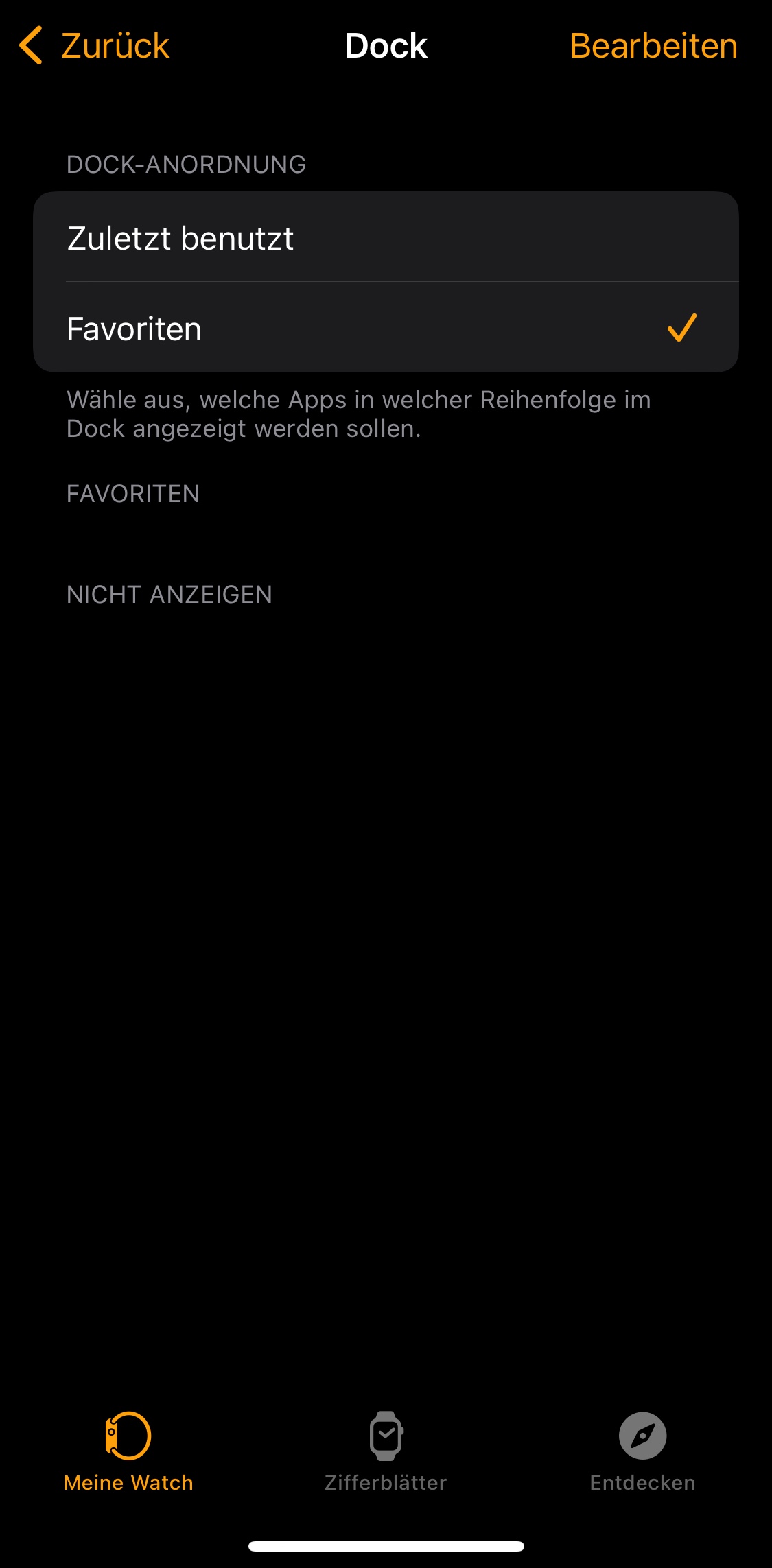 seit dem neuesten Update erscheinen auf der Watch-App unter „Dock“ bei den Favoriten keine Apps mehr. Der Bildschirm unter „nicht anzeigen“ bleibt einfach schwarz (siehe Screenshot).