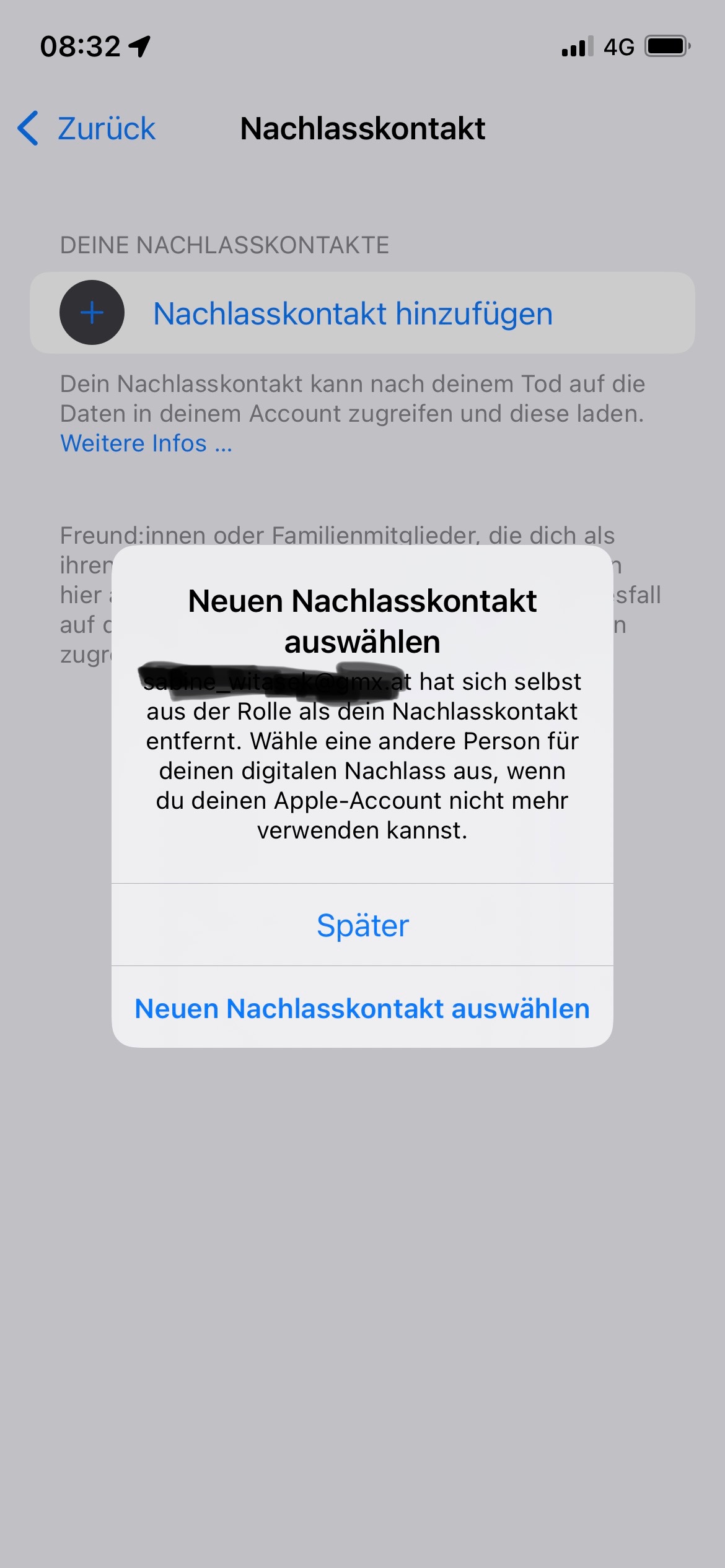 Hallo an alle. Ich kann meinen Wunschkontakt nicht als Nachlasskontakt nutzen. Es kommt immer die Meldung … hat sich selbst als Nachlasskontakt entfernt nachdem er Hinzugefügt wurde