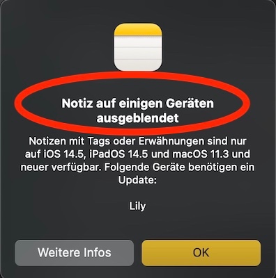 • Wenn du mehrere Apple-Geräte mit iCloud synchronisierst, und auf den Geräten unterschiedliche Systemversionen laufen, könnte es sein, dass manche Inhalte nach einem Upgrade nicht mehr synchronisiert werden können. Nur ein Beispiel, das ich zu spät bemerkt habe: Die neuen Tags in den Notizen sind genial, aber seit ich einige Notizen unter Monterey mit Tags versehen habe, kann ich diese Notizen nicht mehr auf meinen Macs mit Mojave sehen und auf dem alten iPad sehen, meine wichtigsten Notizen werden dort ausgeblendet.