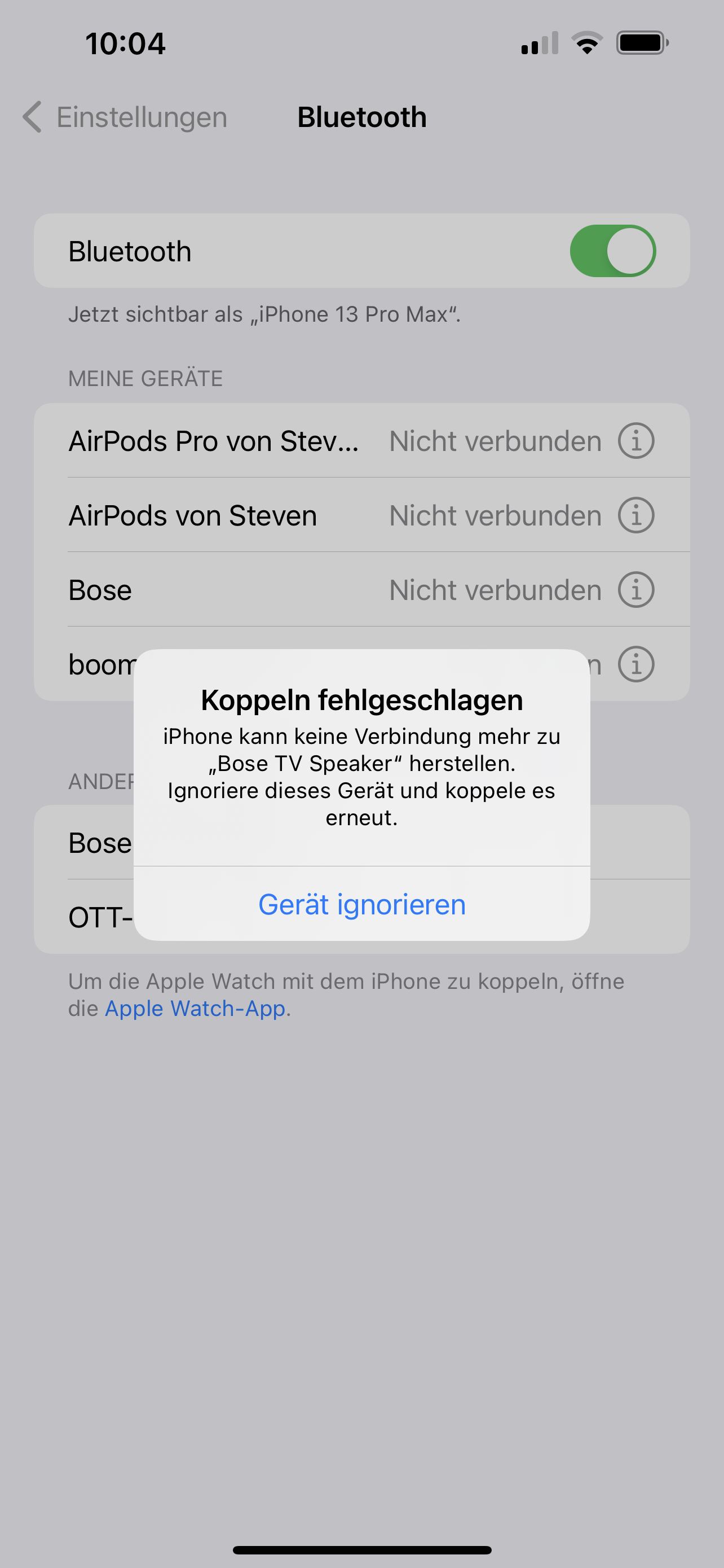 ich habe ein Problem mit meinem iPhone und zwar bekomme verbindet sich mein iPhone nicht mit dem ,,Bose TV Speaker“ obwohl er ihn findet… ich finde es halt sehr komisch das jedes Smartphone sich bis jetzt verbinden ließ bloß das ,,iPhone 13 Pro Max“ nicht.