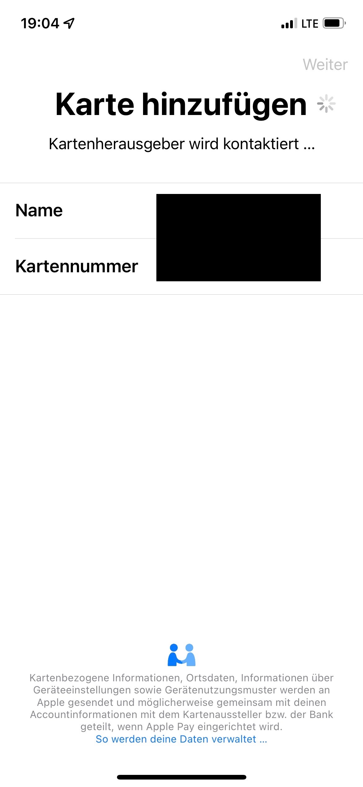 Zuletzt habe ich dann die normale Visa Karte direkt über das iPhone hinzugefügt. Dann musste ich diese im Anschluss noch aus der Wallet über die Banking App „Überprüfen lassen“ und zusätzlich im Anschluss über den Browser im Banking Portal die Apple Pay Nutzung bestätigen.