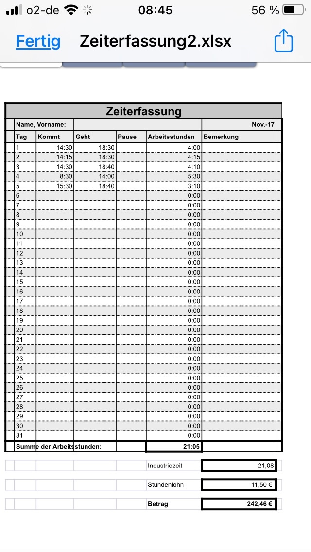 habe es geschafft nach ca 3 Stunden. Jetzt muss ich nur noch die Umrechnung von normalen Stunden in Industriestunden einfügen, damit die Abrechnung stimmt. Vielen Dank für deine Hilfe. Wünsche dir einen guten Rutsch ins neue Jahr
