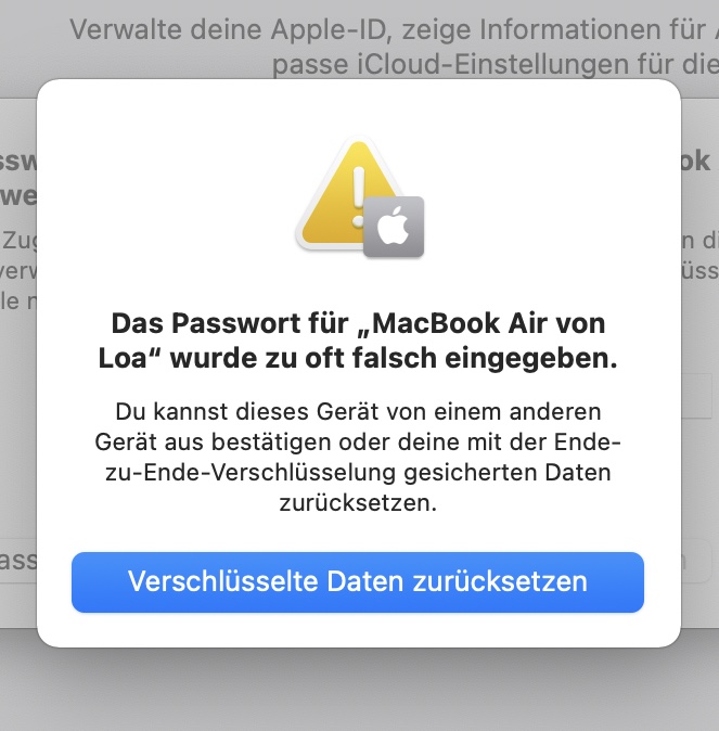 Erhalten folgende Fehlermeldung: Das Passwort für "MacBook Air" wurde zu oft falsch eingegeben.