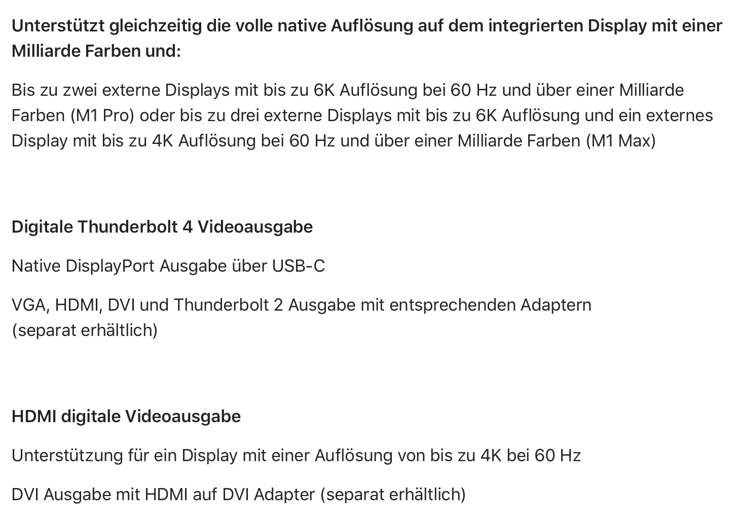 Moin, ich habe gelesen das der Macbook Pro in der 16 Zoll Version mit dem M1 Pro 2 Externe Monitore unterstützt wird dieses nur per HDMI/ thunderbolt zu hdmi unterstützt oder würden auch 2 Thunderbolt zu DisplayPort Kabel funktionieren mein Hauptmonitor hat ein paar Probleme mit HDMI deshalb würde ich dort gerne DisplayPort verwenden (alternativ währe ein Dock für mich auch in Ordnung ) und wie sieht es da aus mit der RefreshRate bin ich da auf 60 Limitiert nutze 1 4k Monitor der 120HZ unterstützt und 1 2560x1440 Hz Monitor der 240 Hz unterstützt